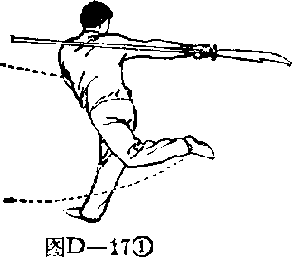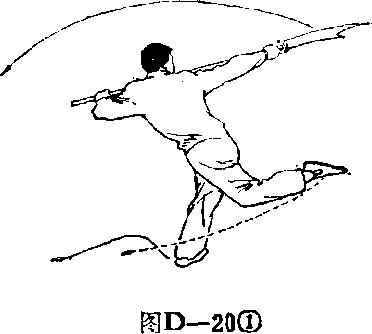 图D—19图D—19(2)上动不停,右 脚蹬离地面,左腿向左落 步屈膝,右腿迅速经左腿