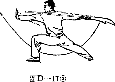 左手随刀上挑时,向下滑握 把顶,高与右膝平,手心 向右,眼视前上方(图D— 18 ②)o