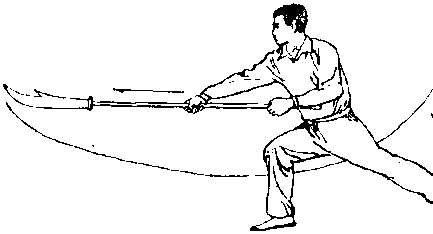 刃朝下,刃尖朝前;左臂屈