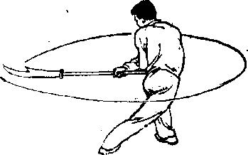 (2)上动不停,右腿屈 膝前上提起,左腿直立;右手 握把,直臂顺时针绕环一周, 手心朝左,高与肩平,使刀背