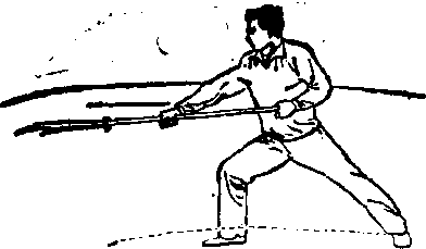 (1)右腿脚跟内转屈膝, 身体随之右转;左脚向右上 步,膝伸直;右手握把,直臂 左后摆,置体右侧,手心向 下,高与肩平,使刀刃向后、 向左平扫半周,刀刃朝后,刀