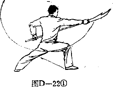尖朝右3左手握下把,屈肘置于左腰侧,眼随刀刃(图D—- 22 ①)。