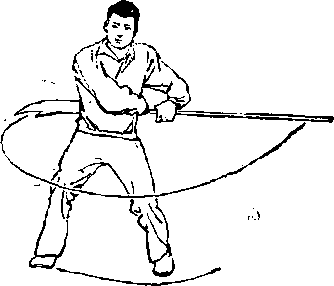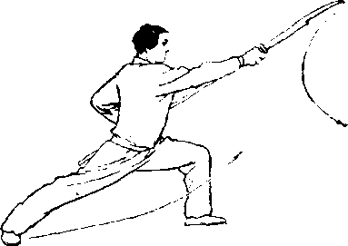 (2)上动不停,身体继 续左转;左腿向右后落步,屈 膝半蹲;右腿伸直,成左弓岁; 右手握把,屈肘逆时针在头上 绕环一周,再直臂左后上摆, 手心向上,高与肩平,使刀向 左、向后、向右、向前环绕,