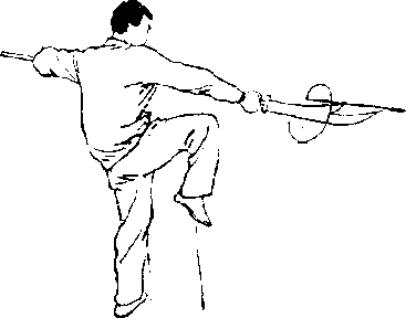 右腿屈膝向前提起,左腿 直立3右手握把,右臂内旋, 直臂下落,高于右膝平,手心 朝下,使刀刃向左向右下截, 刀刃朝后,刀尖朝右下,左臂 屈肘上提至左胸前,左手握下 把,手心朝里;眼视刀刃(图 D—30 )。