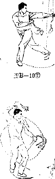 甥一姓1甥一姓1图-2图-2(2)上动不停右脚向左前方好上步右腿屈膝5右力背沿左肩经后绕过右肩,再目力刃向鬻孤形下扫左臂外旋于屈肘上提,手心朝上左刀刃背向左肩绕绕置左背后,刀尖向下才眼视右用(图-11)9