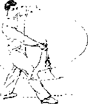 (7)上动不停左脚向左前弧形上步左同膝,右脚跟提起,右力背绕左肩至背后多左刀刀刃向前、向左、向后下扫,随之左臂外旋手心朝上刀尖朝后手眼视前方(图17)。