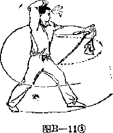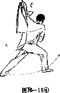 图图(5)上动不停左脚向右前方弧形上步左腿屈膝右脚跟提起手左刀背沿背部缠绕置右肩后刀刃朝右后刀尖朝下,右刀背上提贴靠左肋下眼视左前方(图-113