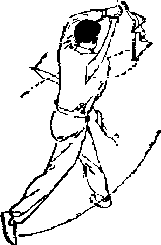 (6)上动不停右脚向左前方弧形上步右腿屈膝,左脚跟提起事左刀背绕过右肩以刀刃向右向前向左弧形下扫置体左右臂内旋屈肘上提刀背沿体左侧向上提起向左肩缠绕置左肩外刀尖向门眼视左刀(图—116)。