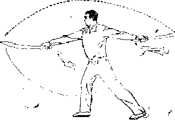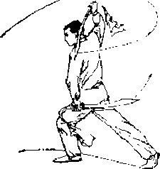 (1)左脚向左前方范形落步左腿屈膝,左臂内旋虎口朝下使左刀面向上1向前下压再以刀刃向下扫至左外刀尖朝后下右臂内旋屈肘上提刀尖朝下刀贴靠左肩,眼视左前方(图—1)立