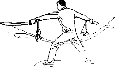 两臂同时外旋两刀尖分别甩向身体两厕再向两侧猛力扎出刀刃朝下眼视右刀(图一27)口