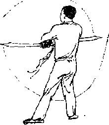(?)上动不停身体左转工右脚向前上步两腿分开宜立右臂顺时针抡一周彼刀向下向前向左向上向右抡劈一圈刀刃朝下尖朝右高与肩平手左刀以刀刃向前向下经两腿前向左抡起抡到身体左恻左臂外旋,刀刃转朝下刀尖朝左手眼视右刀(图—293)