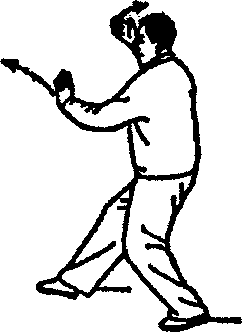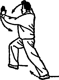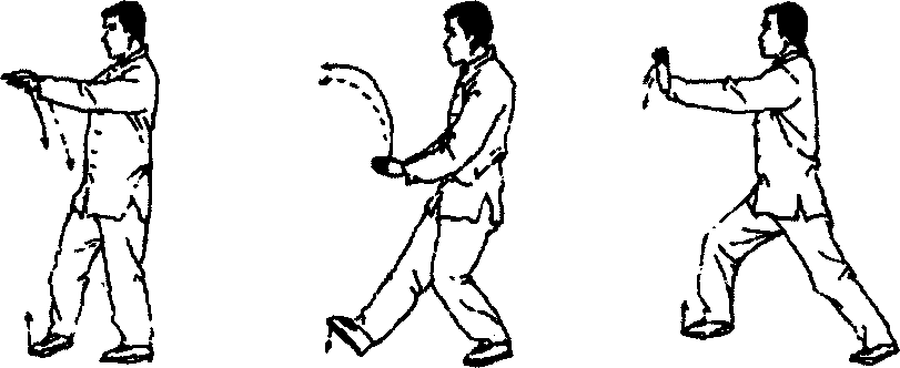 抱球跟脚:身体重心前移,由左腿支撑体重,右脚跟至左脚内