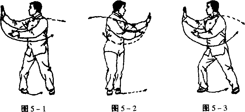 右脚跟落下,左脚跟提起并向左横开一步,前脚掌着地;同时 做右云手;以吸气配合。(图5-1、图5-2、图5-3)