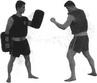 (3)腿靶练习。持靶人右臂戴进靶口内五指抓紧靶扣与踢靶人成反架站立。收前臂置于胸侧靶面侧对踹靶人重心前移右脚微弓。当对方踹击时持靶人给靶一点迎击力(图4-57,4-58)0图4-57图4-57图4-58图4-58