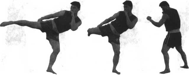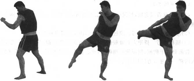 实战姿势开始右脚蹬地身体重心移至左脚右腿膝关节夹紧向前提起左脚以前脚掌为轴脚跟外旋上提右腿的同时右腿小腿外翻接近水平。随即用力拧腰转毓猛力挺膝绷脚面横向由外向内、向上、向前弧形摆踢力达踝关节及脚背部位。击打瞬间小腿、大腿、腰部、上体基本成直线。动作完成后右腿按原路线返回成实战姿势(图4-59至4-64)。