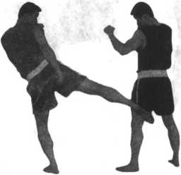 可用于中、远距离的进攻和反击。低位进攻时可以进攻对手大、小腿(图4-65),也可以作为假动作引诱对方伺机进攻。中、高位进攻对方头、胸、腹部也可以配合步法进行反击(图4-66,4-67),