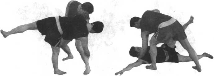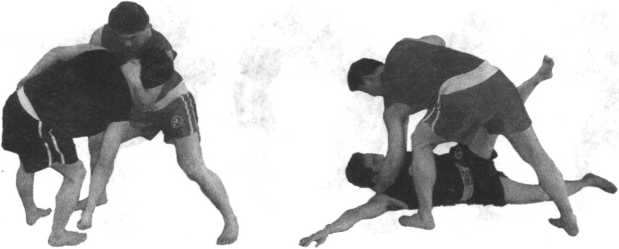 当双方抱缠在一起时我用左手扣住对方的颈部右手控制住对方的右臂时我左手下拉对方的颈部随即顺势旋腕下切对方的锁骨处使其身体后仰同时左腿向前上半步身体前倾右手后拉对方膝窝处将其摔倒(图5-44至5-47)注意左手的拉、切转换要得当右手的拉与左手的切要协同一致。