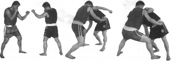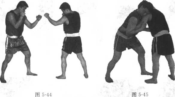 当双方抱缠在一起时我用左手扣住对方的颈部左腿随即后撤一大步身体下沉同时左臂沉肘下拉同时右手推其胯,将对方摔倒(图5-39至5-43)注意领、推协同一致。