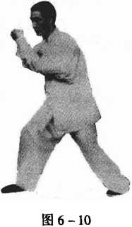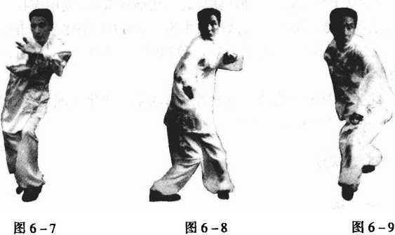 上步时前脚踩出,可成弯套弯步,或早柱步。双膀在一外一 内裹肘时,有一阳一阴之变,是在用膀的内外侧裹劲化敌。可发 抖劲,也可用柔化之劲。此膀可互相配合六艺、十形、七炮、十二 大势或单把、套路,来回移动重心地四面八方盘练(图6 -7、图 6-8、图 6-9、图 6- 10)。