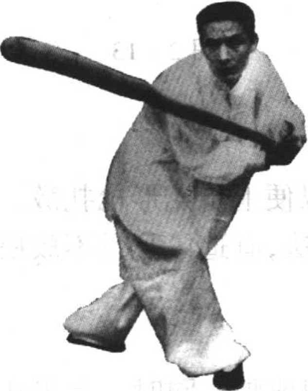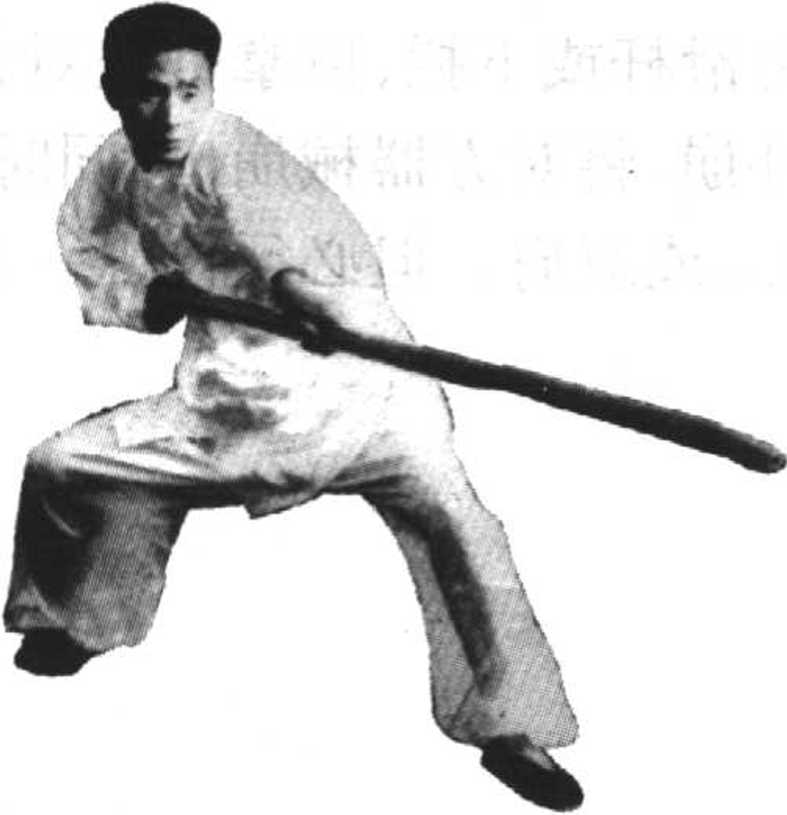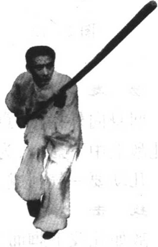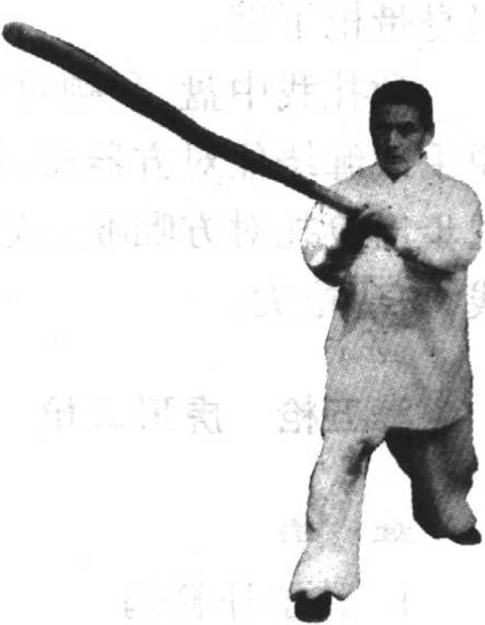 U!U!!1!!1!承上式,左脚向前一步成马步;同时转拧身向前,枪向下劈、 拿、沉、封、压,或向前崩、挑、扎(图2-16)。要四平,枪论云:“四