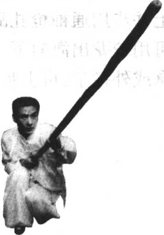 承上式,重心左移,右脚上前半步;同时,两手持杆向右、向 上划弧。重心移于右脚,松右胯向右转,两手合力将枪向右拦击, 重心移于左腿上,右脚向左,接着上左步成马步;同时,两手持杆 合力向右缠,往下劈枪,力达枪尖,目视枪尖(图2-40)。