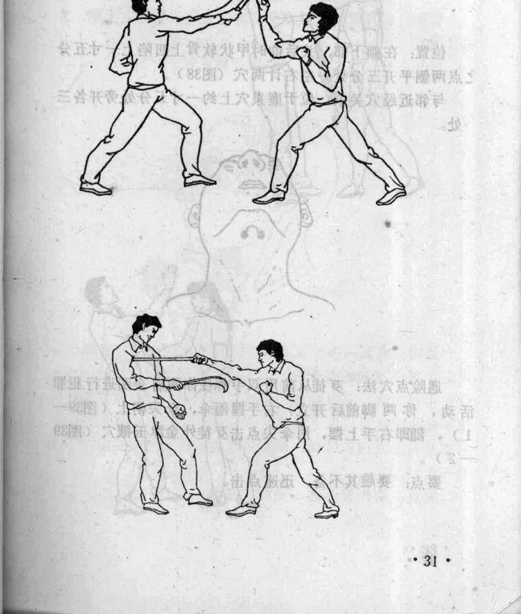 位置在肩部腋前皱翌上方肩锁关节内侧凹陷与腋前皱囊联线之中点。左右计两穴(图36)与邻近经穴关系位于巨骨穴与腋前皱骚连线之间。 厂遇险点穴法当歹徒右手拿柴刀从上向下劈砍你头部时,你右手持短棍上举成反架防守(图37—1),随即右臂内旋并向前伸直用棍尖点击歹徒右肩内陵穴(图37-2)