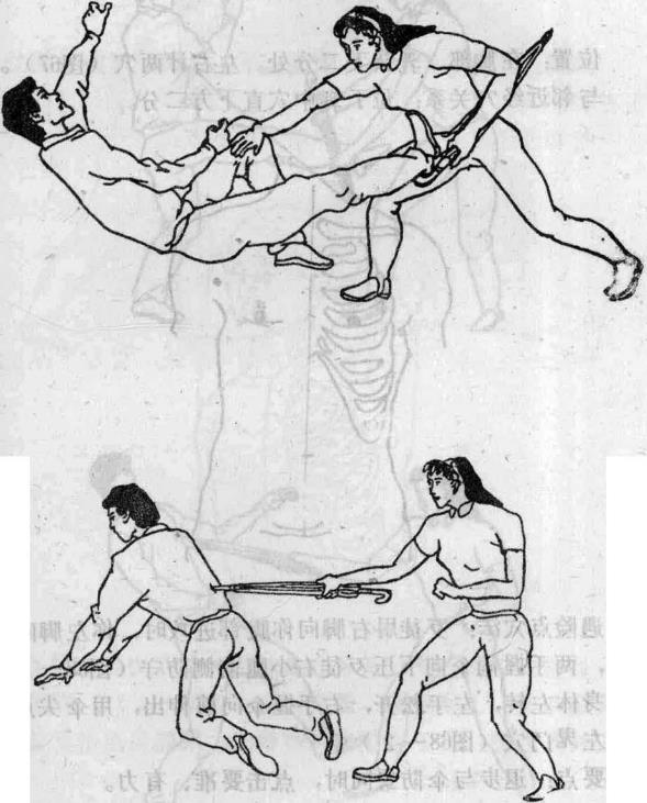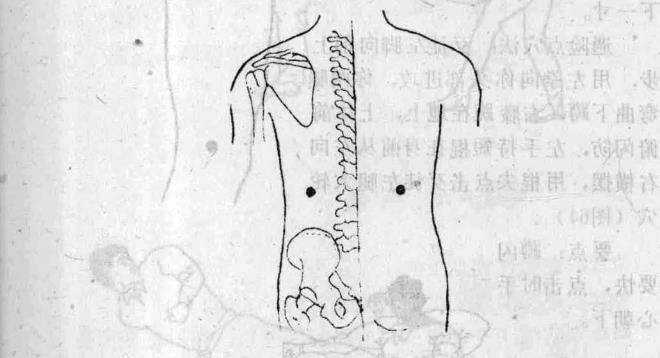 位置在腰部后侧从腰部正中线左右旁开三寸五分,与第一、二腰椎棘突之间点平高。左右计两穴(图65)与邻近经穴关系位于肓门穴外侧五分°遇险点穴法当歹徒从前边将你截住你右脚向前上步上体前俯左手握伞用伞把的弯勾处勾住歹徒前腿跟腱处同时右于向前推击其胸部使其失去重心向后摔倒(图66-1)歹徒身体左转企图爬起时你右手立即从左手拿伞向前下方伸出用伞尖点击歹徒右痞根穴(图66—2)要点勾推要迅猛并形成反向之力要抓住歹徒爬起前的时机点中其穴位