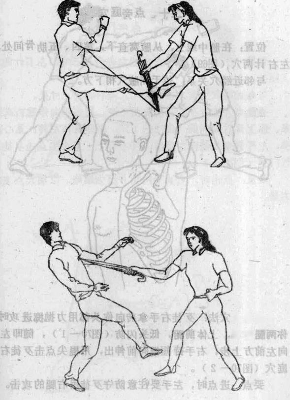遇险点穴法歹徒用右脚向你腹部进攻时你左脚向后退步两手握雨伞向下压歹徒右小腿前侧防守(图68—1),随即身体左转左手松开右手握伞向前伸出用伞尖点击歹徒左鬼门穴(图68-2)