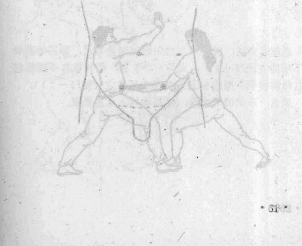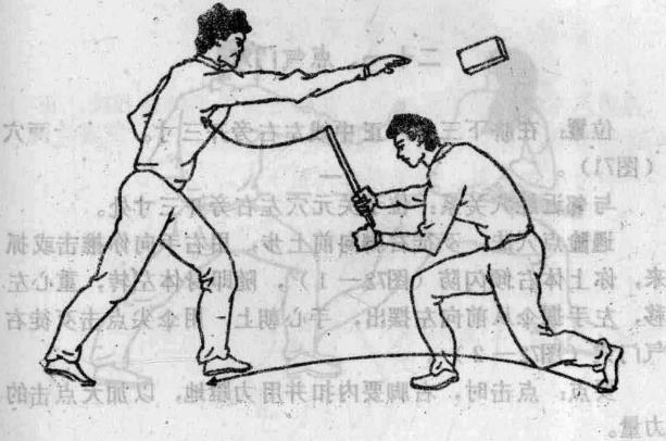 遇险点穴法歹徒右手拿砖向你头部用力抛掷进攻时你两腿弯曲上体前腑低头闪防(图70-1),随即左脚向左前方上步右手持短棍向前伸出用棍尖点击歹徒右旁庭穴(图70—2)