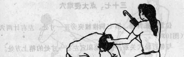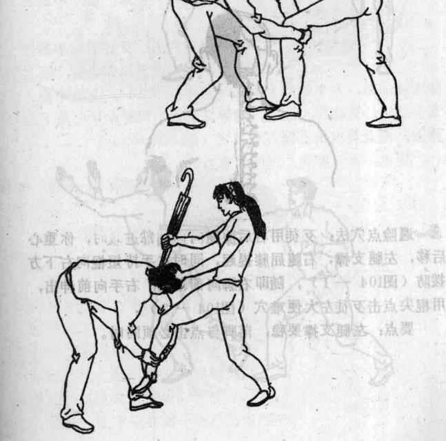 中,后发际之中点(图101)与邻近经穴关系位于度门穴下五分。遇险点穴法歹徒上体前俯两手向前下方抓搬你左腿时你用左手抓住歹徒的头发用力向下拉按(图102-1),随即右手握伞向前下方戮击用伞尖点击歹徒翊血穴(图102—2)要点点击时抓头之左手不要松开。