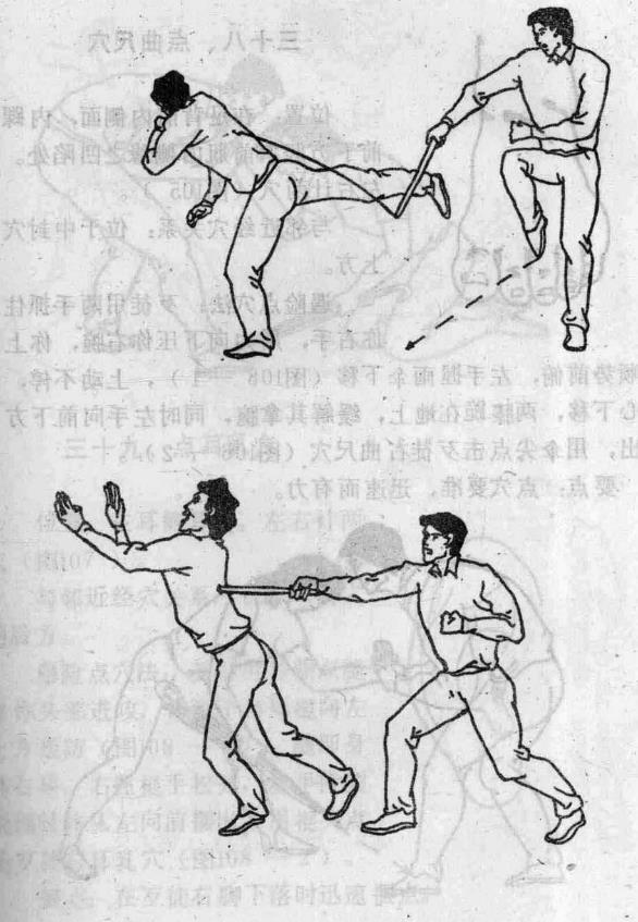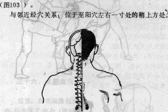 位置在背部第七胸椎棘突旁开一寸处。左右计两穴遇险点穴法歹徒用右后撩腿向虾裆郊进,你重心后移左腿支撑右腿屈膝提起同时右手持短愿向右下方拨防(图104—1),随即右脚向前落地右手向前伸出用棍尖点击歹徒左大便难穴(图104—2)-要点左腿支撑要稳落脚与点击必须同时。