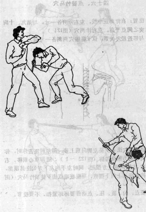 位置在背部正中线左右旁开各一寸与第九、十胸椎棘突之间点平高。左右计两穴(图121)与邻近经穴关系位于筋缩穴两侧各一寸处。遇险点穴法歹徒左脚向前上步用左肘顶击你时你-体向右前方俯身闪防(图122-1),随即重心前移右腿支撑左腿向前上方摆起同时左手向左下方勾拉其顶部,右手持短棍从上向下摆戳用棍底端点击歹徒骑竹马穴(图122—2) 要点闪、顶、压、点动作要环环紧扣不要脱节。、104