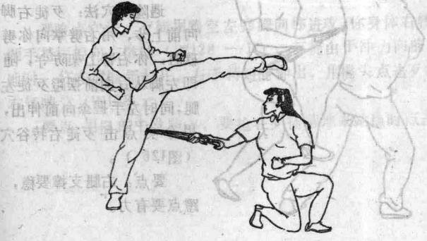 切- 1 位置在大腿胫侧肌骨内上 般上方胭窝横纹上三寸处。左右 计两穴(图123) 与邻近经穴关系位于血海穴 上一寸。 遇险点穴法歹徒用左侧踹腿 ,向你身体上部进攻时你两腿弯曲 1重心下降闪防右手握伞点击歹徒 右支撑腿的百虫窝穴(图124) 1要点在歹徒出腿时迅速点击 闪点要同时。