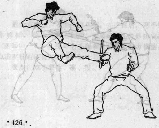 位置在肩胛骨下角尖端处。左右计两穴(图151)与邻近经穴关系位于至阳穴左右旁开四寸处。遇险点穴法歹徒向前跳起在空中用左侧踹腿向你进攻你身体左转右手持短棍向外拔防(图152-1)歹徒两脚在前落地你身体左转90°,右手随转体向前伸出用棍尖点击-歹徒左银口穴(图152—2)。要点要在歹徒没转身回头时点中穴位。41位位在腰部第二腰椎棘突左右旁开四寸。左右计两穴(图153) 与邻近经穴关系位于志室穴外下方约一寸处。