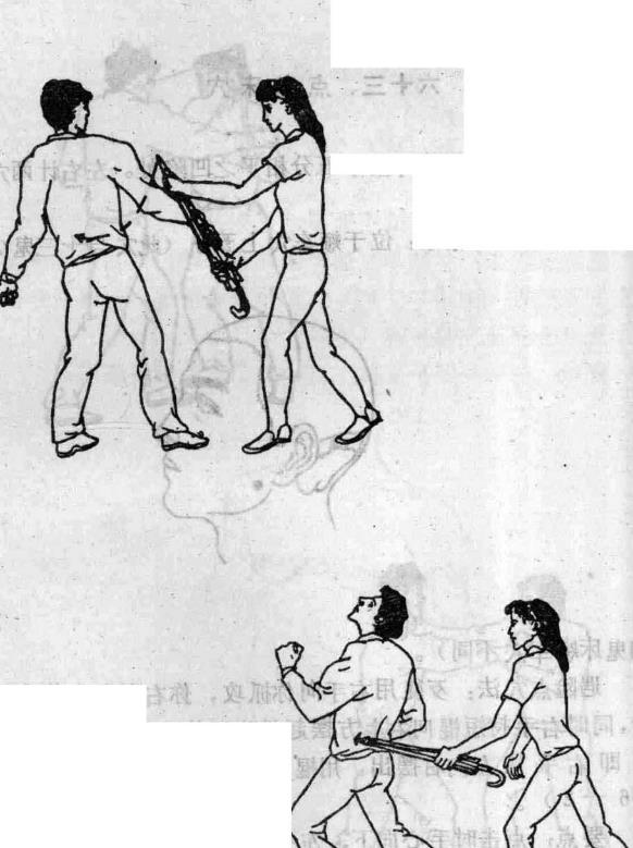 (图154—1),你左脚向前上步左手向前抓住雨伞上段处向上翻拧右手同时向左下方扭摆迫使歹徒身体左转右臂成反关节状松手(图154-2),你左手立即滑动握住伞下段右握伞手放开左手从左向前弧形摆出用伞尖点击歹徒左血府穴(图154工一3)要点整个动作要二气呵成迅速有力。靴目拒蔺垂早虹民出瘤盘穴餐避最
