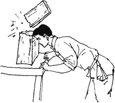 练法头功在练习时可用软帛束首,使之围绕数十,匝,然后将头向墙壁上顶、撞、点之每日行若干次而且练习须提气充脑初时不必猛力顶撞因骨未坚而易损脑待练稍久后再逐渐加重顶撞次数也随之增加。勤习半年则初步功成将所束之帛减少二三层然后再如法习之逾百日再去二三层。至一年之久以至于完全除去则第二步功成。而以头与墙壁直接顶撞初时颇苦行之日久则头与墙同具坚硬而全功告成。此时用头攻击可使石碑碎为两段(图65),其威势功力由此可见。