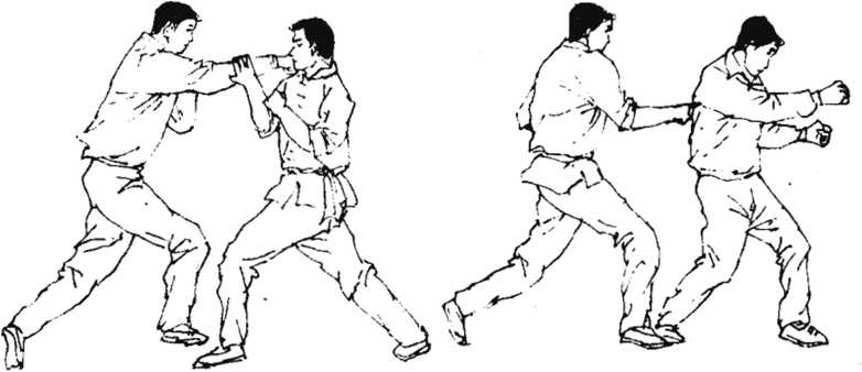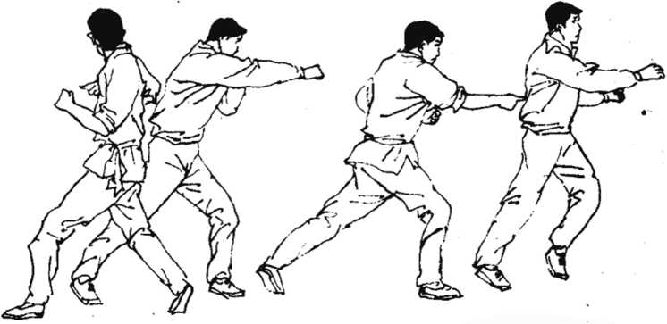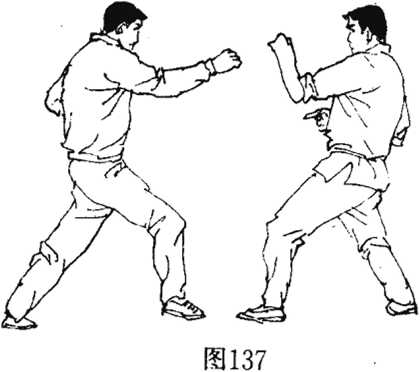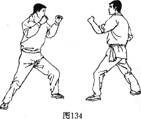 点打要领在技击对抗中(图134),对手箭步落脚成右弓步同时出右拳向我头部打来时我可速施横马以右手牵化打招并闪身而过(图135),然后乘其扑空而前伏欲倒下时速回头转身出右指猛点其后背之精促穴(图136)。