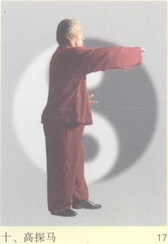 your right hand backwards, with the palm facing and the left arm extended slightly, palms facing downward. At the same time, lift the left leg and step back off center, the left foot coming down toe first. Transfer your weight back to the left leg, pushing the right hand forward past the ear, while pulling the left hand back to come to rest at the left hip. Sit on the left leg with the right heel down. Pivot your right foot on the heel with the toe slightly off the floor, as the right leg relaxes. Your body should be inclined at a slight angle to the left and does not face straight ahead. Your right palm should be in line with your chest sitting on the wrist.