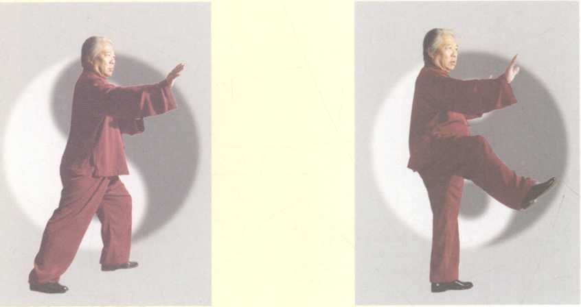 <10〉Turn your waist clockwise and circle your right hand backwards with palms facing forwards. As your raise your body on the rear leg and draw the left leg in by turning your waist slightly anticlockwise. Your right foot is the solid foot and the left is hollow. Touch the floor with the ball of the left foot. At the same time, turn the left palm anticlockwise to incline upwards, while retracting it to the waist. The right hand is brought in towards the ear and with fingers relaxing and palm facing the floor. The right hand moves to strike with the outer edge of the palm. Avoid straightening the right arm.