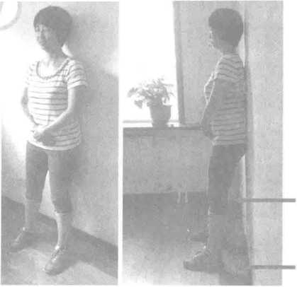 双脚与肩同宽后背靠门站立脚后跟距离门半脚长距离膝盖自然放松微弯不挺直