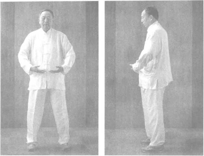 站法身体各部位的要求与第一式相同区别在于本式以两手为掌掌心向上曲臂、沉肘、两手五指——相对两中指间的距离很小但不要互相接触