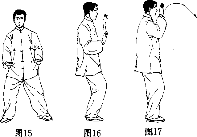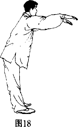 (2)双腿蹬地缓缓站起,同时两臂内旋随身体 上升环矢状轴向上划圆于胸前;两手掌心向下,两 臂间距与两肩同宽,眼看两手指尖(图13J4)O