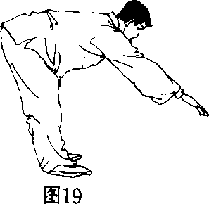 以意贯注祖窍,配合动作引气下行于中丹田后 转入命门,然后再经两肾俞、环跳沿两腿外侧足三 阳经至两足。