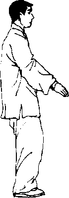 (5)双腿蹬地缓缓站起,同时两掌垂肘下按合 于腹前,两臂呈环状,两手心向内,指尖相对,眼向 前平视(图23)。