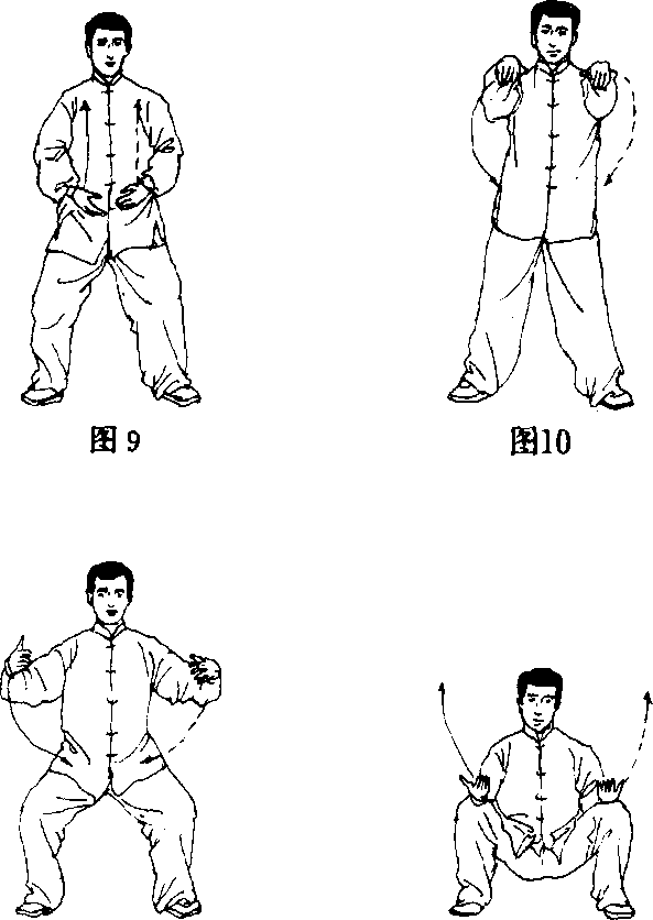 下;然后双腿屈膝全蹲,同时两臂外旋随身体下降 环矢状轴向下划圆于腹前;两手掌心向上,两臂间 距与两胯同宽,眼看两手指尖(图9、10、ll、12)o