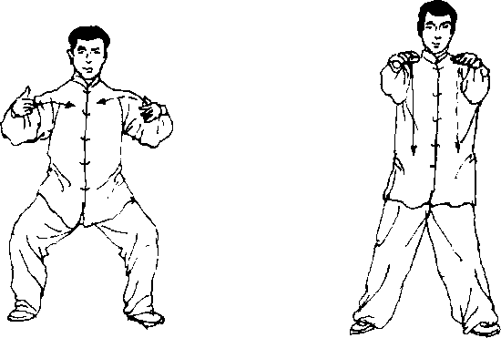 以意贯注四梢(两足涌泉,两掌劳宫),配合动 作引气回归中丹田。