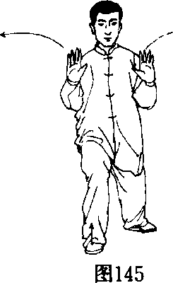 (1)左腿屈膝,上体后坐,身体重心移至左腿, 右脚尖翘起;同时两手分别向左右划弧至侧平举, 指尖均向上,两臂肘微屈;眼看右手(图145) o