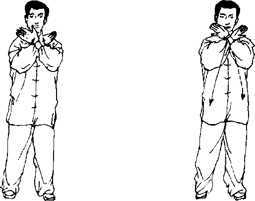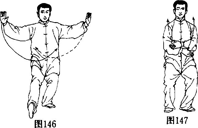(2)右脚向右收回,两脚距离与肩同宽,左脚以 脚掌为轴转正,两腿逐渐蹬直,成开立步;同时两手 向下经腹前向上划弧交叉合抱于胸前,两臂撑圆, 腕高与肩平,右手在外,成十字手,手心均向内;眼 看前方(图146、147)。