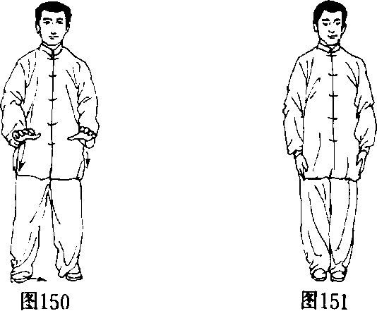 两手向外翻掌,手心向下,两臂慢慢下落,停于 身体两侧,然后重心移至右腿,左脚向右脚靠拢,成 并立步;眼看前方(图148,149 J50.151)o