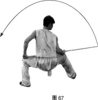 接上势,身体右转,右腿屈膝,成马步;同 时,两手握棍随转体由前下经上向右下挂劈棍至两 大腿上方;目视右前方。(图67)
